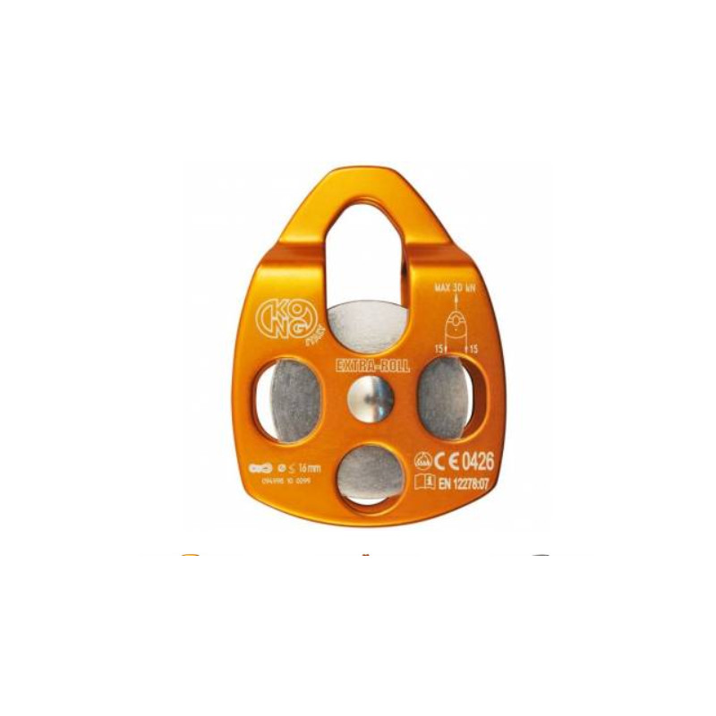 Poulie simple avec réa en aluminium sur flasques mobiles et roulements à billes à haut rendement (96%).