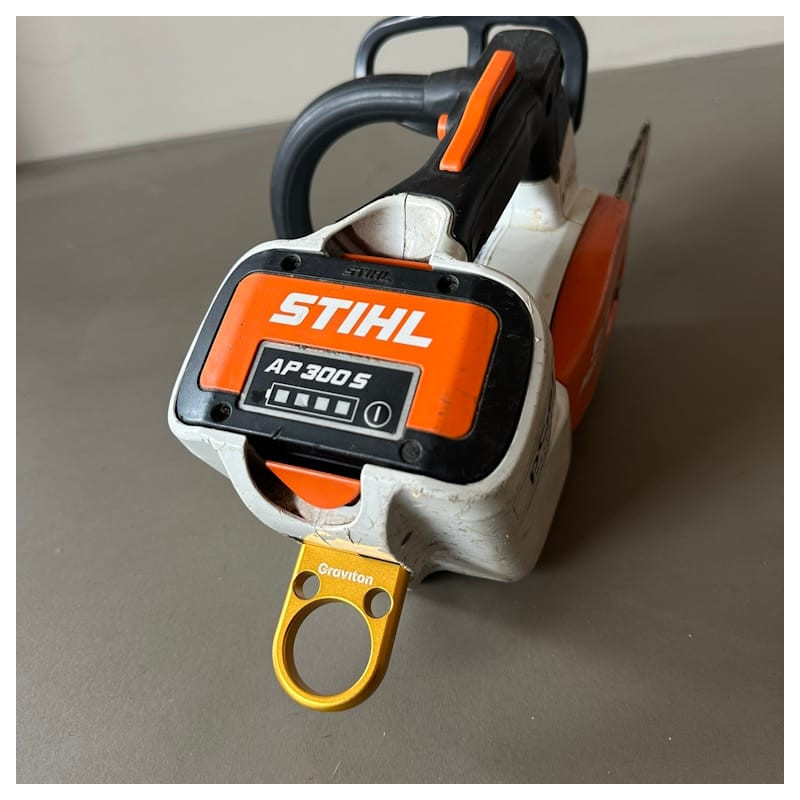 Graviton Cutan, l’accessoire ultime pour votre tronçonneuse. Conçu pour rendre votre travail en l 'air plus sûr, plus facile et plus efficace, permettant un rangement sans effort d’une seule main.