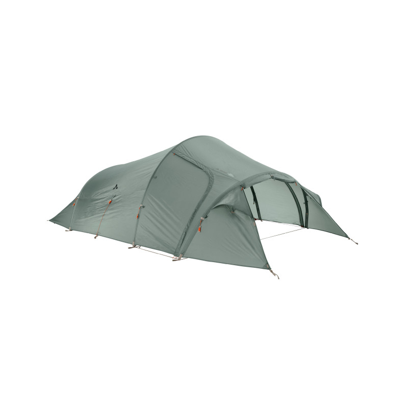 Tente de trekking spacieuse et ultrarésistante aux intempéries pour 4 personnes #rapport espace/poids exceptionnel #avec gaines d'armature fermées sur un côté et signalisation colorée pour un montage aisé #fabrication complète du matériau de la tente extérieure et du fond à partir de bouteilles PET recyclées