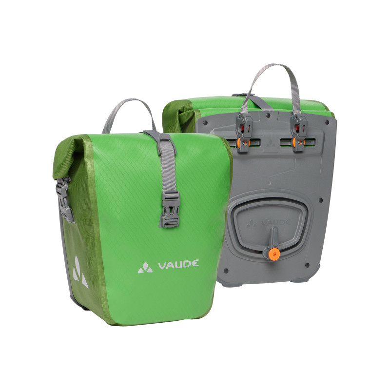 A la découverte du monde ! Cette sacoche étanche pour roue avant, en bâche résistante sans PVC, est fabriquée sur le site allemand de VAUDE au bord du lac de Constance. Elle n'attend que vous pour partir à l'aventure ! Grâce à une fermeture par enroulement totalement étanche, sa taille est ajustable et son contenu reste bien au sec. Une poche intérieure supplémentaire permet de bien ranger ses affaires. Ces sacoches sont fixées à droite et à gauche du porte-bagages arrière et stables grâce au système QMR 2.0 et à une plaque rigide. Elles sont ajustables à l'aide de petites roues et peuvent rapidement et facilement être fixées et enlevées. Ces sacoches pour roue avant peuvent aussi bien s'utiliser sur la roue arrière. Elles peuvent être attachées directement au crochet QMR en utilisant tout simplement un cadenas à vélo. Le volume total des deux sacoches est de 28 litres. Avec des éléments réfléchissants. Contenu: deux sacoches (parie).