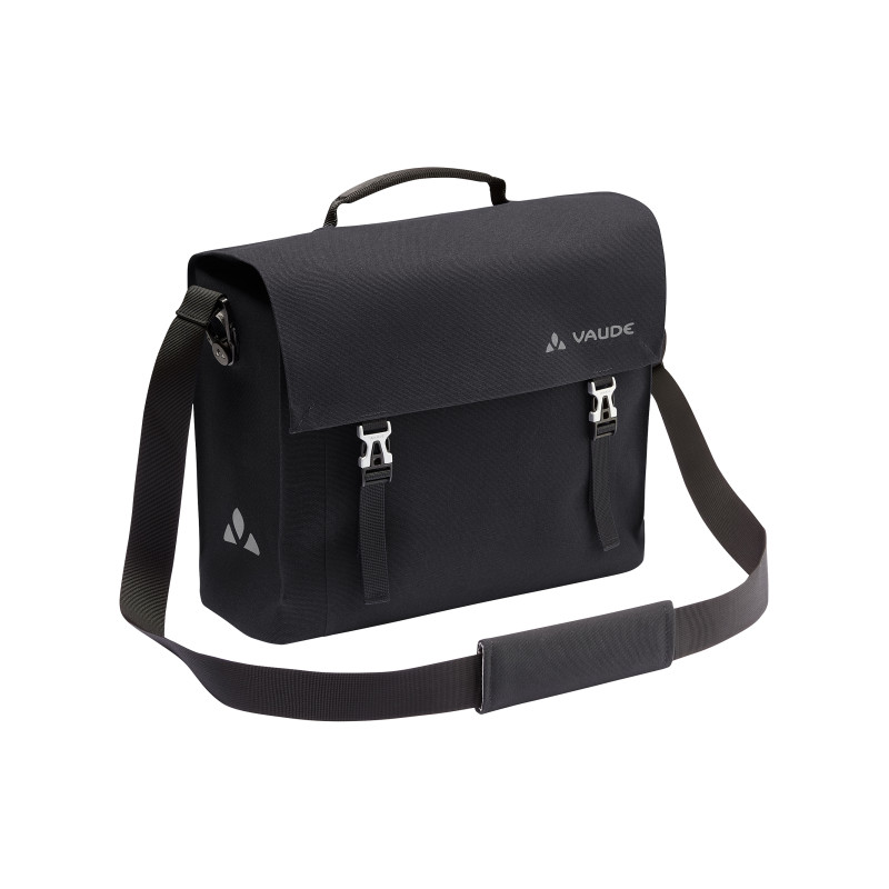 La serviette porte-documents pour le vélo. La sacoche pour roue arrière de taille moyenne Bayreuth M au format serviette porte-documents est fabriquée dans un matériau polyamide à l'aspect textile avec jointures étanches et entièrement sans PVC. L'ordinateur portable 13" est bien protégé dans le compartiment rembourré à côté de documents A4 rangés dans le compartiment principal. Le matériau intérieur clair assure une bonne visibilité: un porte-clés, un compartiment pour mobile rembourré, un porte-crayons et une boucle pour insérer une gourde complètent l'équipement intérieur. Le sac s'installe et se retire du porte-bagages (jusqu'à un diamètre de 16 mm) à l'aide du rail de fixation Plug and Ride réglable. L'opération s'effectue simplement à la main. Un petit cadenas de vélo (p. ex. VAUDE TSA Combination Lock II, non compris dans la livraison) permet de verrouiller la sacoche directement sur le crochet QMR. Les petits pieds au sol garantissent une bonne stabilité, et la sacoche se transporte aisément à pied avec ses poignées ou sa bandoulière bien rembourrée. Les éléments réfléchissants sur l'avant et aux côté renforcent la visibilité. La sacoche de vélo est confectionnée au siège de VAUDE en Allemagne du Sud selon une technique de haute fréquence, revendique un design épuré et une qualité haut de gamme Made in Germany.