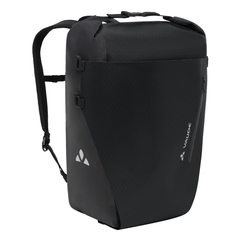 Sacoche de vélo et sac à dos 2 en 1 innovante, 100 % imperméable Made in Germany dans un design linéaire et intemporel pour la navette ou les loisirs. Le sac à dos à fermeture roll-top très spacieux de 26 l est muni d'un dos rembourré et d'une sangle de poitrine; il se transforme en sacoche de porte-bagages en un tour de main. Les bretelles se rangent dans une poche filet au dos du sac et sont sécurisées par un cache frontal rabattable. Il est muni d'une pochette avec zip imperméable qui peut se retirer pour le nettoyage du sac. Grâce au système de fixation QMR 2.0 éprouvé, la sacoche-sac à dos 2 en 1 se fixe en toute sécurité sur le porte-bagages (avec des tiges rondes de 8 à 16 mm max.) et se retire tout aussi aisément en tirant sur la bande reliant les deux crochets. Les crochets QMR peuvent être verrouillés à l'aide d'un petit cadenas de vélo (p. ex. serrure TSA, non compris dans la livraison). La combinaison de sacoche-sac à dos offre un bel espace de rangement avec une organisation interne bien pensée: un compartiment pour ordinateur portable jusqu'à 13,3"" avec des pochettes extérieures supplémentaires pour ranger un smartphone, des stylos, etc. Selon le chargement, la sacoche-sac à dos 2 en 1 peut se comprimer latéralement sur 3 niveaux. Le matériau robuste du sac en aspect textile est étanchéifié par thermosoudage dans la manufacture VAUDE et entièrement exempt de PVC. Avec logos réfléchissants.